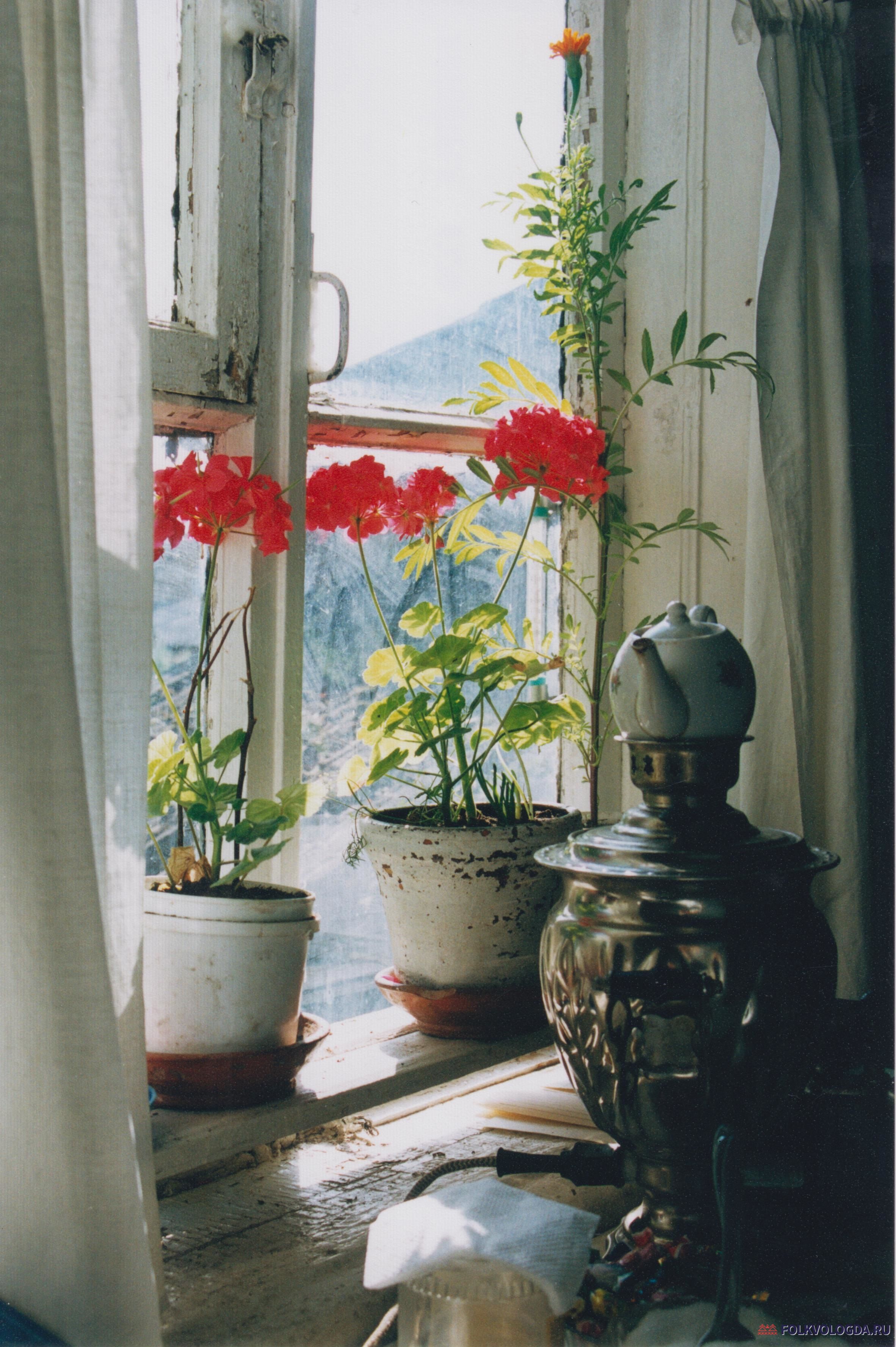 Фото цветов на подоконнике и самовара на столе в доме Тереховой О. И. в с. Андомский Погост.