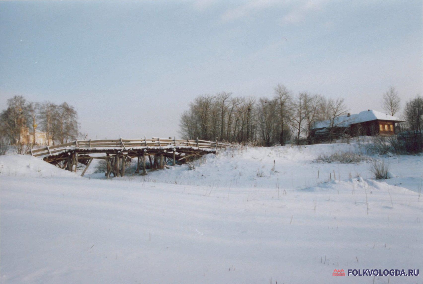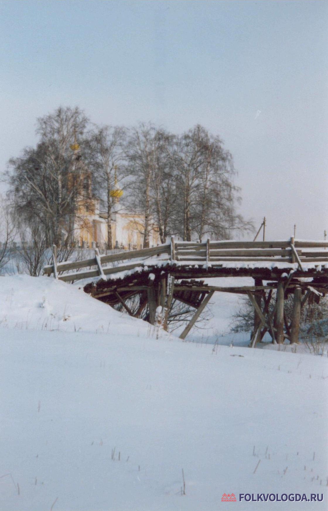 Фото деревянного моста в с. Архангельское, слева – храм Святого Духа