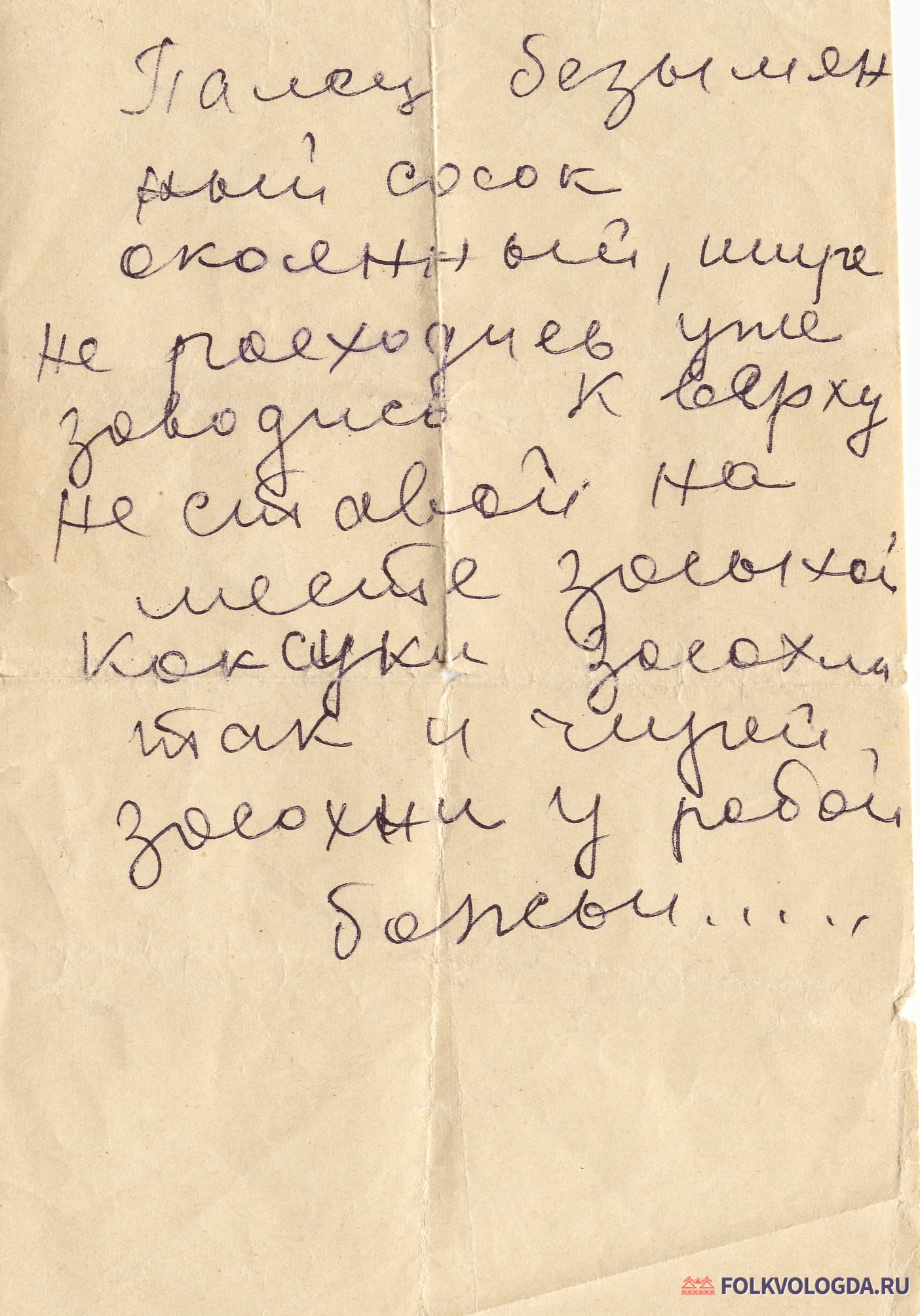 Палец безымянный, сосок окоянный, шире не расходись, уже заводись, к верху не ставай, на месте засыхай.