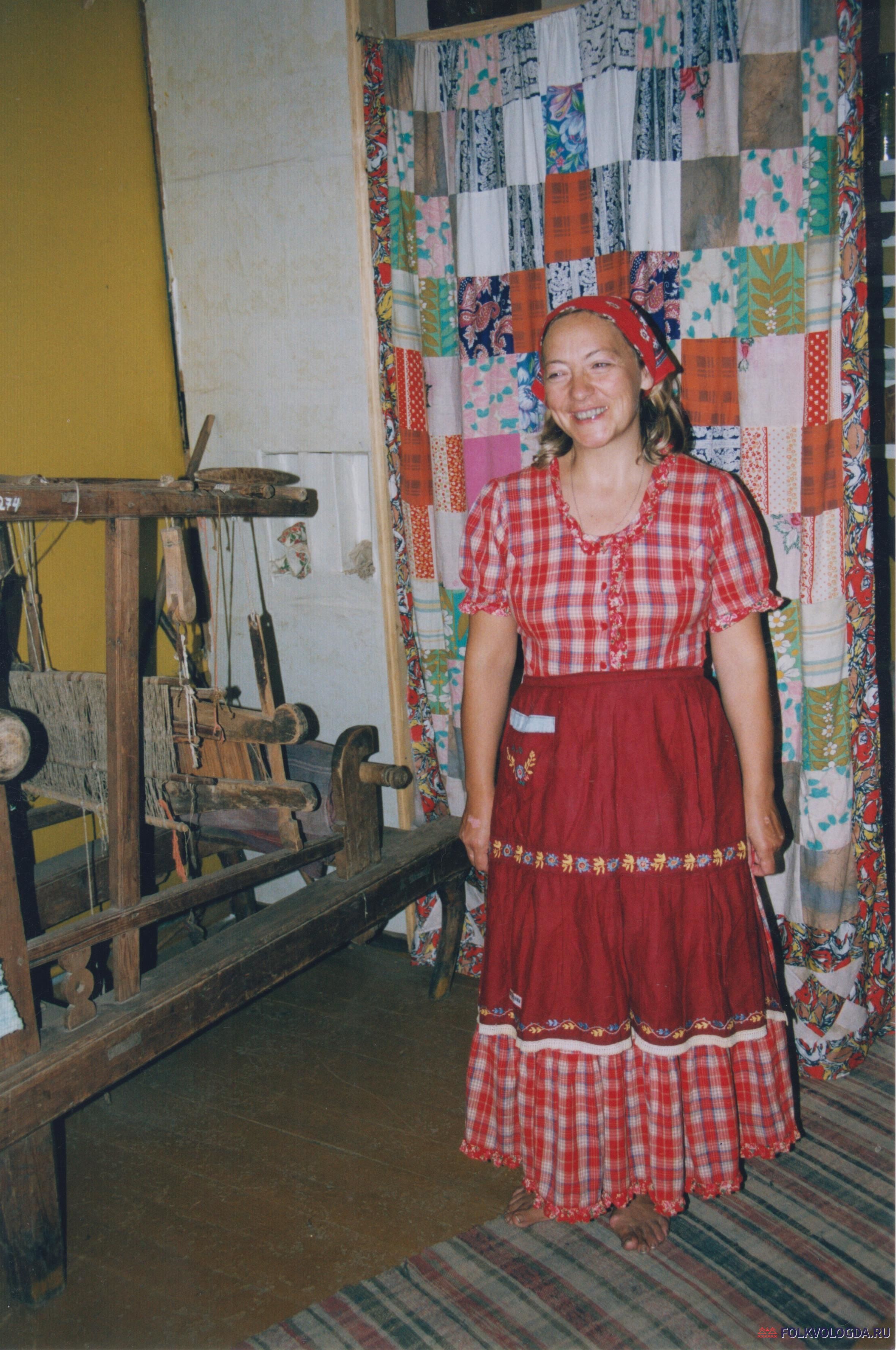 Фото участницы экспедиции Марковой Л. Ф. (г. Санкт-Петербург) в традиционном переднике (экспонат школьного музея г. Вытегры)