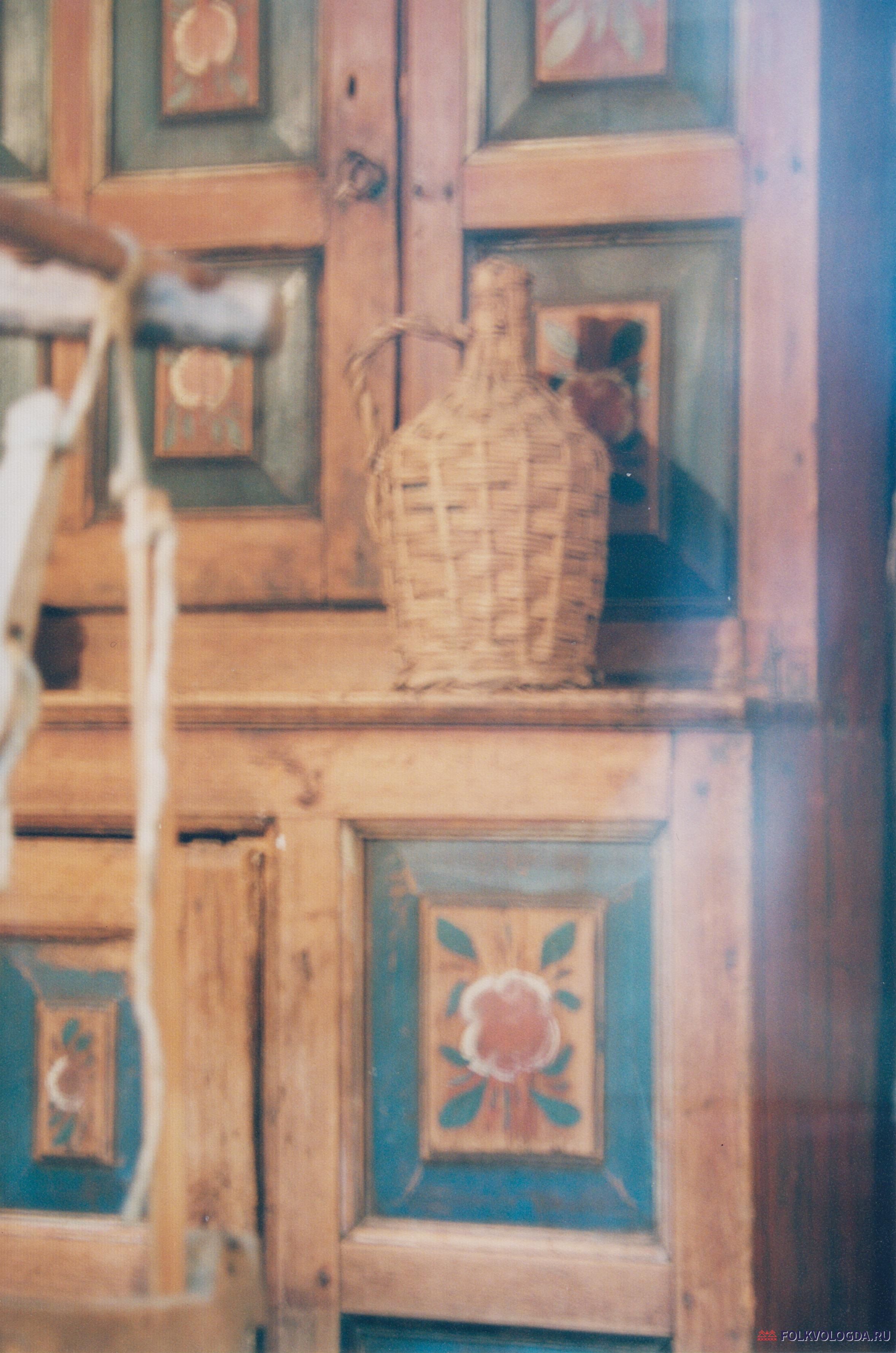 Фото расписного шкафа с оплетённой бутылью в краеведческом музее г. Вытегры