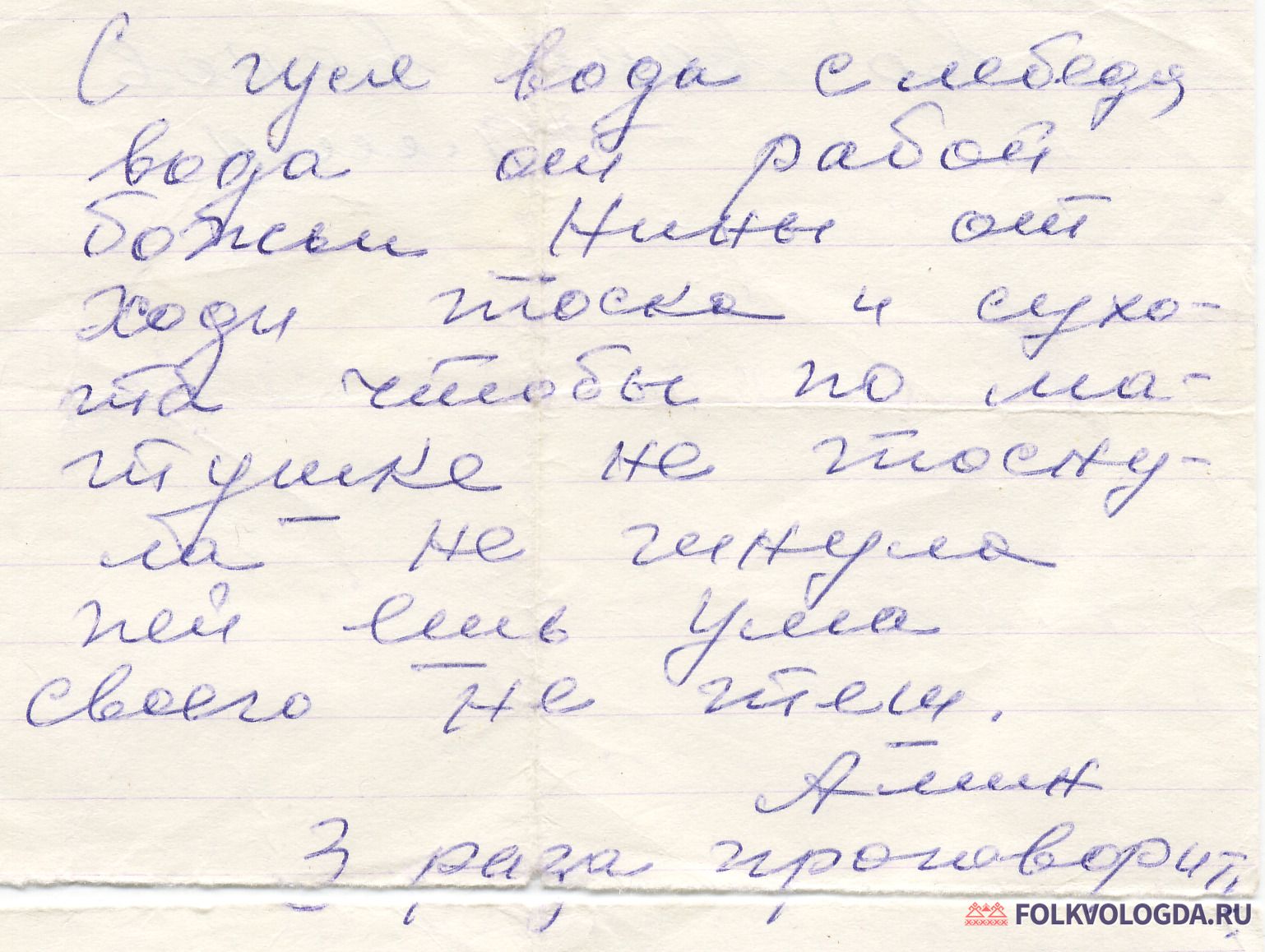 С гуся вода, с лебедя вода, от рабой божьи Нины от ходи тоска и сухота, чтобы по матушке не тоснула, не гинула, пей, ешь ума своего не теш[ь]. Амин.
