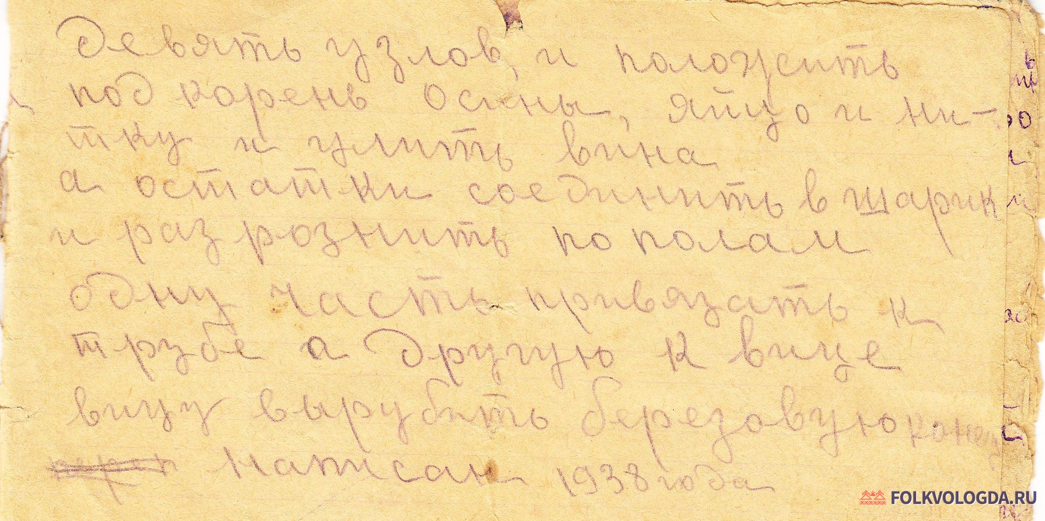 2 обходить стадо в лесу, у дерева стоячаго осины, где мало ходят люди, поставить три свежих восковых, и взять яйцо и шерстяную нитку и у нитки связать девять узлов, и положить под корень осины, яйцо и нитку и улить вина а остатки соединить в шарик и разрознить по полам одну часть привязать к трубе а другую к вице вицу вырубить березовую конец написан 1938 года