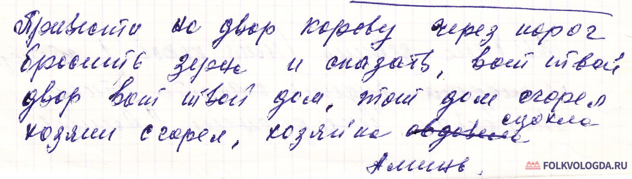 Вот твой двор, вот твой дом, тот дом сгорел, хозяин сгорел, хозяйка [овдовела] сдохла. Аминь.